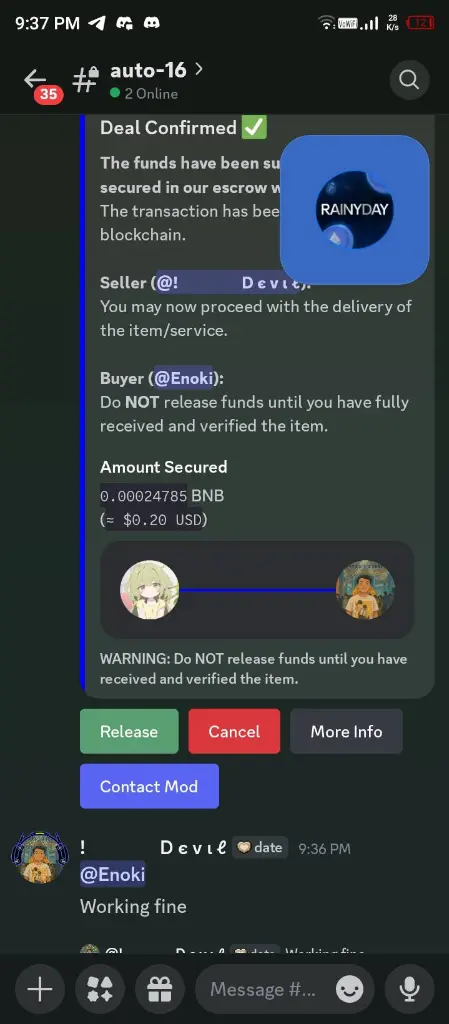 Choose your cryptocurrency and enter your partner's Discord ID. The bot will then display the Escrow Dashboard.